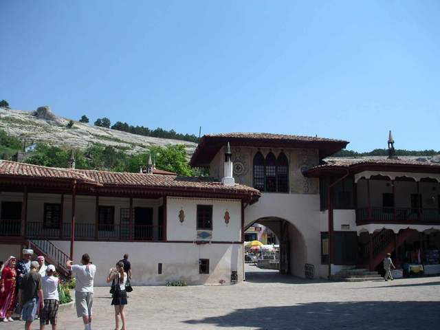 The former khan's palace making now the town's focal point of interest is suppised to be erected in early 16th century. Later on it underwent many rebuilding and alteration. So present-day aspect of the palace gives no idea of how it looked at those times. Now the Khan-Sarai occupies an area of 4 hectares, in the 16th century its area was a great deal larger. The fence and western gates were adjoined by gardens, that made an integral part of the palace complex. In fact, they gave the town its name (Bakhchisarai means palace-garden or palace in the garden, both words "bakhcha" and "sarai" that form this toponym being derives from the Persian). Beyond the gardens there was a palace meadow where khan's horses browsed and further at the foot of a clayey hill was a large town's cemetery.