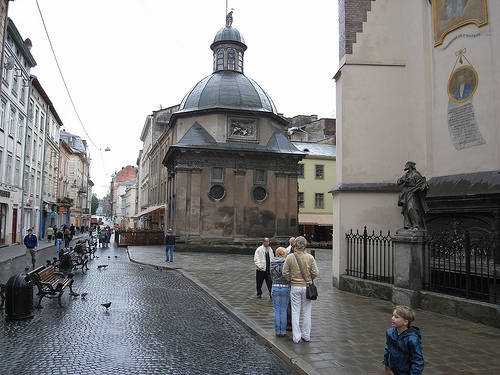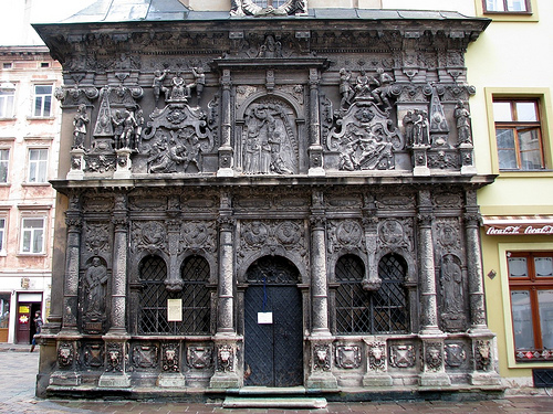 This unique monument adorns Cathedral Square; this lane leads into one of the best views of Rynok Square and City Hall. Georgiy Boim,a Lviv merchant of Hungarian origin, who grew rich trading wine, obtained Lviv citizenship simultaneously with the post of burgomaster, and decided to build a family chapel of unparalleled beauty. The building, designed by Andrzej Bemer, a constructor from Wroclaw, was consecrated in 1615.