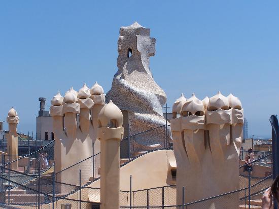 The roof is probably the most extraordinary of the building. It features a number of surrealistic colorful chimneys. Many of them look like warriors in a science fiction movie, others look more frivolous. The roof also features a bench similar to the one in Park Guell. From the top of Casa Milà, you have a nice view over the Eixample district.