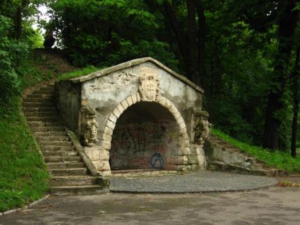 The chestnut alley ends with a small gardener’s house (1892) surrounded by many exotic plants. An artificial cave with the inscription reading “August 15, 1841” was placed here as a decoration for the park in mid-19th century. The cave’s entrance is guarded by two 17th-century stone lions from the old City Hall. They hold shields with the coats of arms of Lviv patrician families. This cave was once called “The Suicidal Cave” because people who fell in love but could not be together due to circumstances of life committed suicides here.