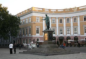 The monument to one of the founders of the city, Duke de Richelieu in Primorskiy Boulevard is one of the main places of interest of Odessa. Its pictures can be found on pamphlets, cards and even stamps. Duke de Richelieu (b. Sept. 25, 1766, Paris, Fr.--d. May 17, 1822, Paris), French nobleman, soldier, and statesman who, as premier of France (1815-18 and 1820-21), obtained the withdrawal of the Allied occupation army from France. Earlier, he had served Russia as governor of Odessa and was notable for his progressive administration there.