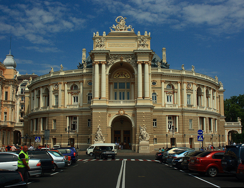 Odessa Opera Theater is famous primarily for its architecture, and is one of the best in Europe due to its planning and technical data. The building itself is constructed in the style of the Viennese "baroque", which was the major stile in European art since the end of 1916 to mid-18th century. Above the facade there towers a group of sculptures depicting one of the Muses – Protectress of the Art Melpomene. She sits in a chariot, harnessed with four furious panthers. Downstairs, near the main entrance, there are two groups of sculptures on high pedestals embodying the comedy and tragedy: on the left - a fragment of the tragedy of Euripides “Hippolytus", on the right - the episode of the comedy by Aristophanes “Birds”. Across the pediment of the building one can see the busts of brilliant creators of Russian Literature and Art: Pushkin, Glinka, Griboyedov, Gogol, who embody the poetry, music, drama and comedy.